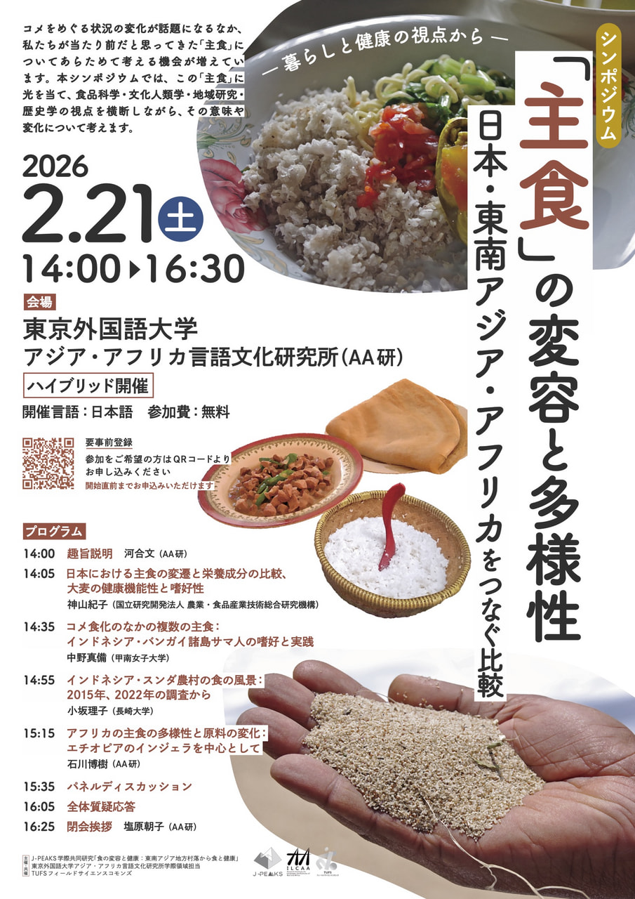 コメをめぐる変化が話題になるなか、本シンポジウムでは、食品科学・文化人類学・地域研究・歴史学の視点から、「主食」の意味と変化について考えます。お気がるにご参加ください。