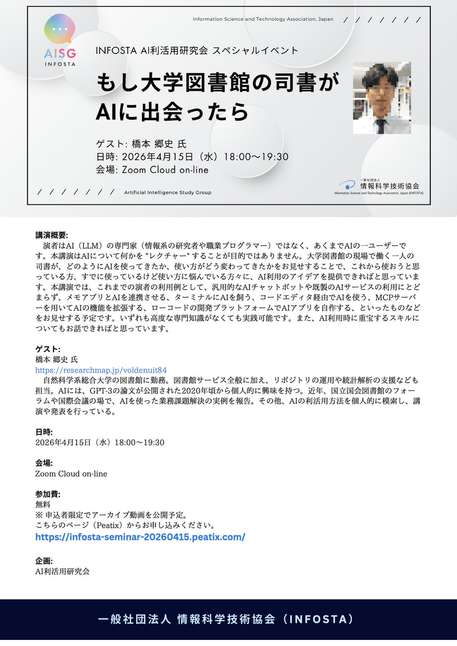 INFOSTA AI利活用研究会 スペシャルイベント: もし大学図書館の司書がAIに出会ったら