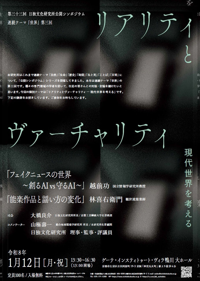| URL | 第三十三回日独文化研究所公開シンポジウム 連続テーマ「世界」第三回「リアリティとヴァーチャリティ — 現代世界を考える」 https://www.nichidokubunka.or.jp/symposium.html |