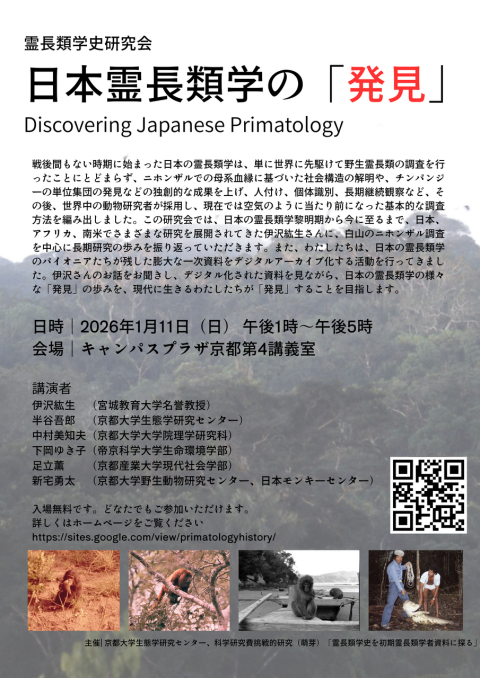 | 紹介文 | 本研究会では、日本の霊長類学黎明期からの長期研究の歩みを振り返るとともに、デジタル化された資料を見ながら、その様々な「発見」の歩みを、現代に生きるわたしたちが「発見」することを目指します。 |