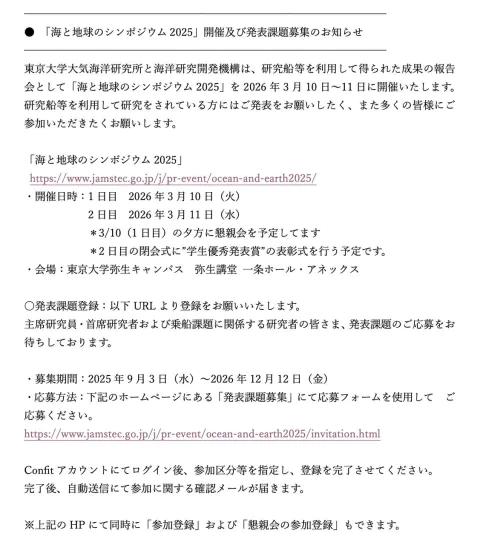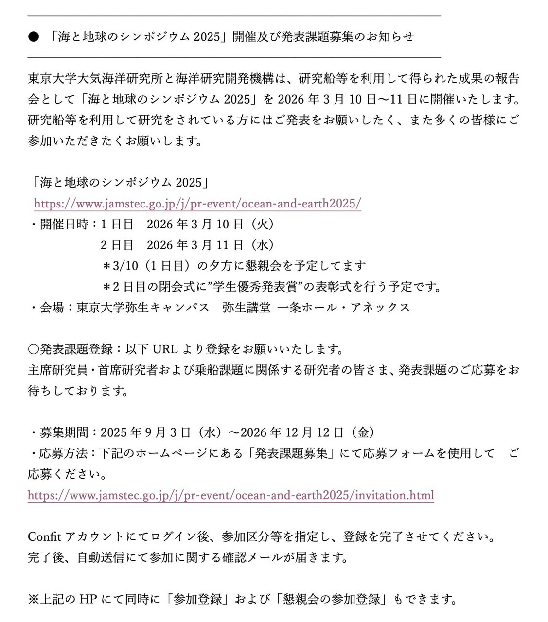 | 紹介文 | 「海と地球のシンポジウム2025」開催決定!皆様の参加登録をお待ちしております。海のサイエンスに興味のある方、ぜひ現地もしくはオンラインでお越しください! |