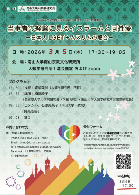 | URL | 南山大学人類学研究所 第2回公開講演会「当事者の経験に見るイスラームと同性愛―日本人LGBT+ムスリムの場合」 https://rci.nanzan-u.ac.jp/jinruiken/activities/report/029955.html |