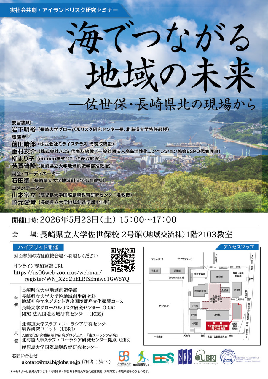 | 主催 | 長崎県立大学地域創造学部 長崎県立大学大学院地域創生研究科 地域社会マネジメント専攻国境離島文化振興コース 長崎大学グローバルリスク研究センター(CGR) NPO法人国境地域研究センター(JCBS) |