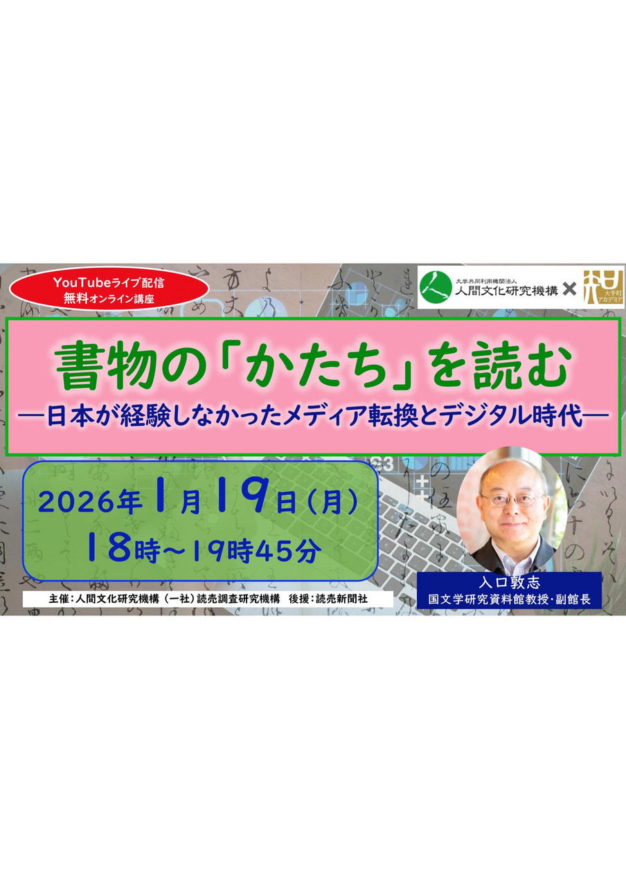 国文学研究資料館の副館長、入口敦志氏を講師に迎え、日本の書物文化の歴史において、書物の「かたち」が、それぞれどのような意味をもっていたかを解説し、メディア転換と日本人についての新しい視点をもたらす。